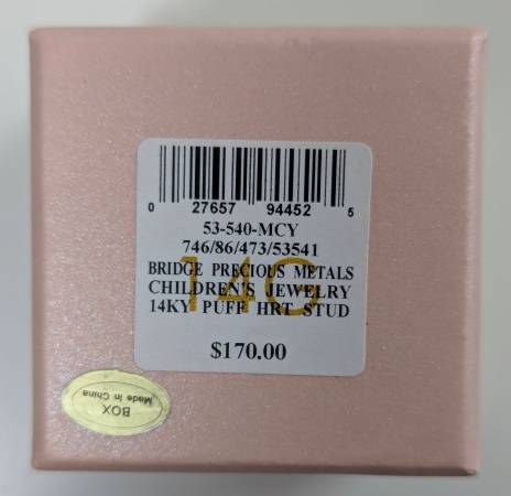This listing is for one pair of genuine 14K yellow gold children’s small earrings, from Macy’s. Made of solid 14K yellow gold. Each heart measures approximately 0.25” across and 0.25” long. The studs include screw-on safety backs, to ensure that the earrings will stay firmly and safely in place. Brand new, never worn, and in perfect condition. Comes in beautiful pink and gold gift box, with original tag (MSRP = $170). Would make a beautiful gift, especially for a first birthday, piercing present, Christening, Communion, etc! The earrings themselves are in pristine condition, shiny, never worn, and brand new. The gift box is also in like-new condition (it has very minimal superficial scuffs in a few spots).