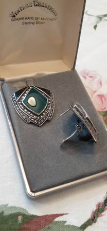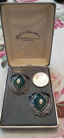 Gorgeous Large 1 1/4" x 1 1/4" Sterling Silver & Marcasite Earrings with Posts & Security Clip. Black Onyx & Jade. Stunning Art Deco Design Earrings in Orig Box.