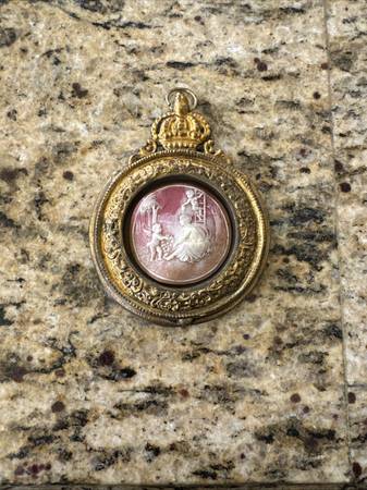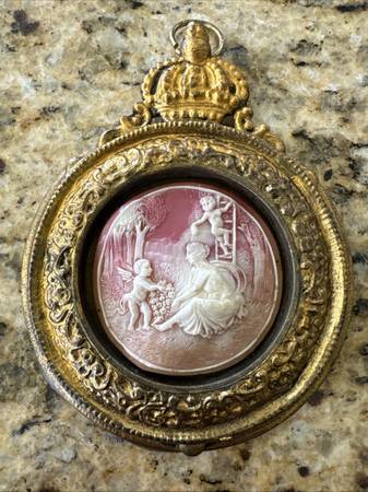 Beautiful vintage E.A. Riba Co. cameo brooch featuring a large carved shell cameo set in a goldtone metal frame. This versatile piece can be worn as a brooch or pendant and is perfect for collectors or anyone who loves retro jewelry styles.