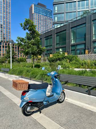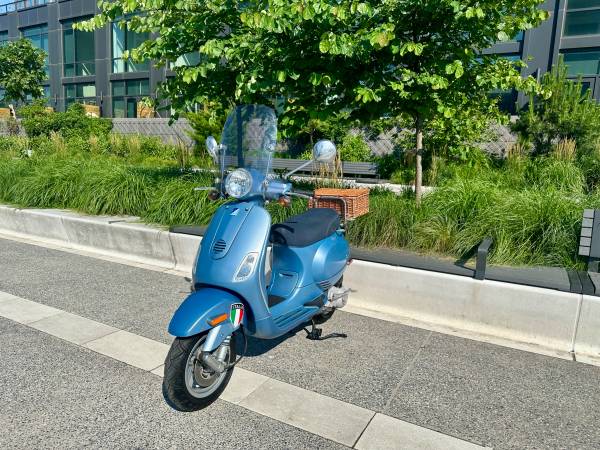 Clean Title in Hand. Beautiful Satin Metallic Blue with Large Windshield, Vespa Original Rear Folding Rack and Vintage Style Wicker Top Case Luggage, 150cc engine with Only 5,300 miles.
