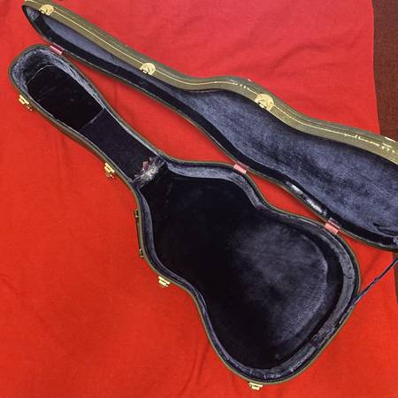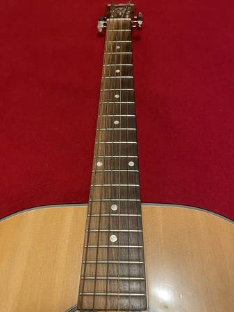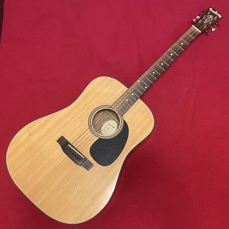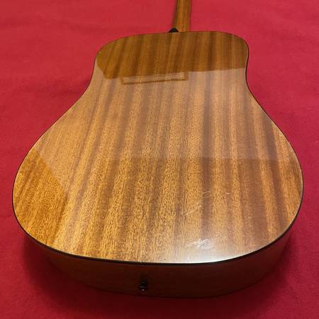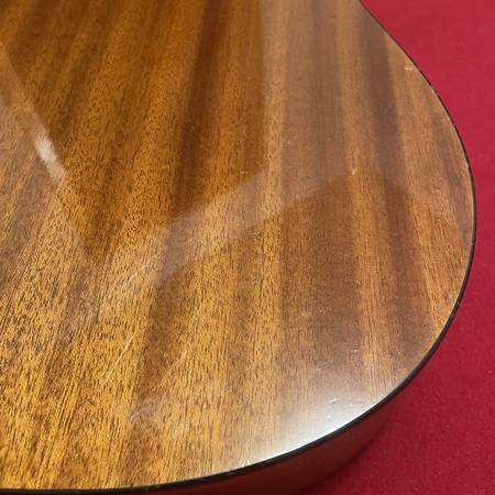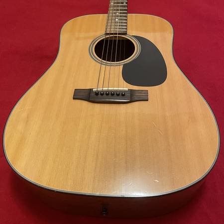 Gorgeously arrayed in natural finish with solid sitka spruce top, laminated mahogany back and sides, traditional bracing, and a slim, fast neck, this handsome instrument is modelled after the Martin D-18 and is all set up and ready to play. It also sounds great, with a clear, rich, classic tone, and a rosewood fretboard which plays beautifully. Guitar has a few nicks and scuffs, but is in perfect working order, with almost no visible fretwear. Overall, I'd rate this at about a 7 or 8 out of 10 in terms of its cosmetic condition. Cosmetic issues include: