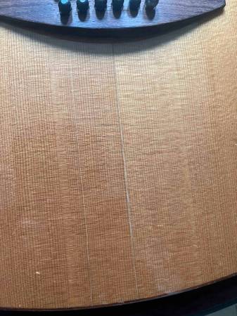 Comes with 5 additional bridge pins, and various random other accessories as pictured. Fishman was stock installed. The jack is a little loose, as pictured. The front and back down the middle have a small gap, but these are very easily handled by a skilled luthier.