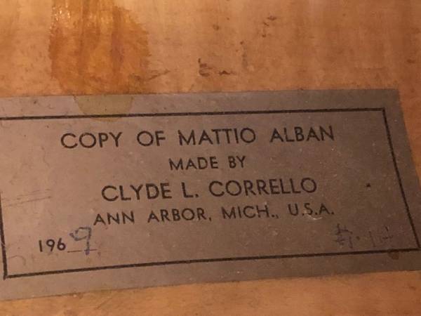 Here is a bit on Corrello, who was born in 1895, from his obit: "Clyde L. Corrello, 74, musician, mechanical engineer and one of the nation's few professional violin makers, died Wednesday at Huron View Convalescent Home after a lingering illness. He had been a resident of Ann Arbor for 26 years. Mr. Corrello made violins, violas and cellos for some of the country's leading musicians for many years at his instrument making shop at 4320 Washtenaw Rd. He also had played the violin and cello with a number of small and large orchestras, including the Toledo Orchestra and the Ann Arbor Symphony. He was one of a handful of American violin makers whose creations brought prices of $1,000 and up. Mr. Corrello was born Nov. 14, 1895, in Dayton, Ohio, a son of Claude M., also a violinist, and Margaret N. McDowell Corrello. He graduated from Northeastern University in Boston with a mechanical engineering degree. A veteran of World War I, he served in the U. S. Army in France. He was a member of the First United Presbyterian Church of Ypsilanti. Mr. Corrello carne to Ann Arbor in 1944 and studied with private teachers and with composer Hanns Pick at the University of Michigan. Pursuing his craft of making instruments, he used his collection of rare instruments, including a 250-year-old Austrian cello and another made in Vienna in 1690 by Seraphim, in his work in order to maintain high standards. He and Ester Huston were married on June 30, 1920, in Toledo."