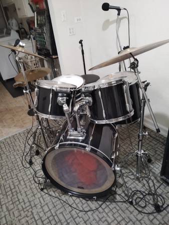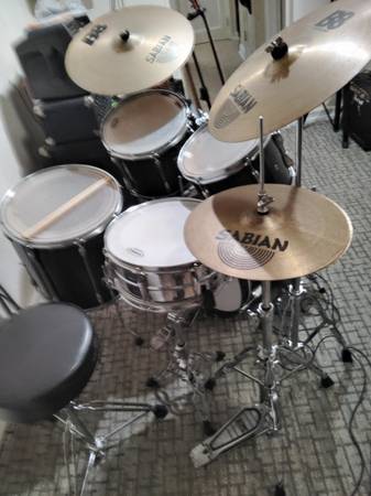 complete drum set . ready to play with Sabian cymbals this set goes new for over 1000 dollars just need to make room ,,,not playing anymore leave your number so I can get back to you Pick up only