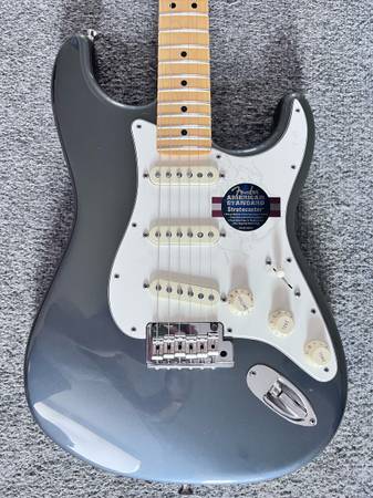2012 fender Stratocaster standard in excellent new condition no marks or blemishes on it…frets are 100% in a Pewter Gray color inspired by Eric Clapton the C shape modern profile neck is smooth fast and comfortable comes with Fat 50’s custom shop pickups probably their best pickups for that vintage sound case candy and tremolo bar included. Cash on pickup