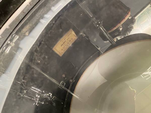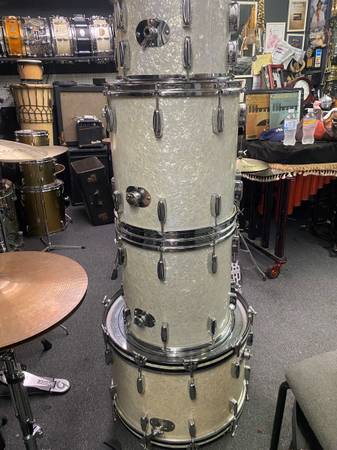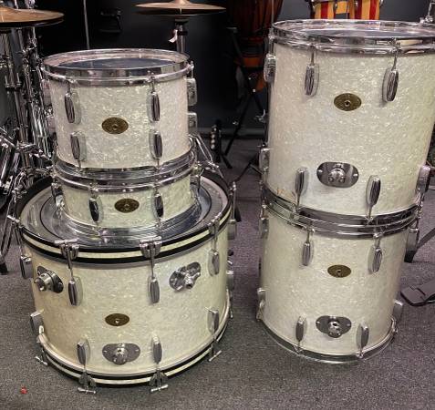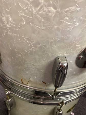 Rogers 1950s white mother of pearl eagle badge drum set very rare, very good condition 22 inch bass drum 9 x 13“ mounted Tom, two 16 inch floor toms,5by14 power tone snare,comes with Tom holder& cymbal stand, only 2FLAWS on the drum set one is a slight cracking of the pearl on the lower end of the floor Tom and the other is a slight split in the covering on the bass drumboth will be included in photos, The drums have all brand new pinstripe skins on them and have been kept in cases for over 40 years the drums sound amazing there are a few slight cracks in the Tom logs but everything Tunes up and is functioning and playable The drums sound amazing fat &full