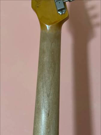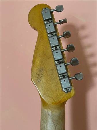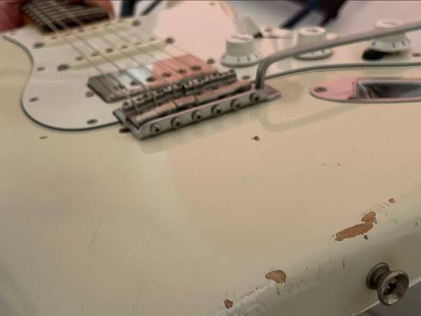 The only 'issues' are some very mild dark discoloration where the right arm rests and on the back of the guitar. Also it's missing the Rust water decal. All the nicks and dings are the relicing.