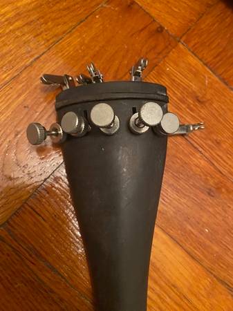 This can be converted to a 4 string cello very easily. I got this cello to play and I'm just not going to be able to get to it it. Currently, it's a rare 5 String Baroque. If you wanted to swap out bridges and have a new head nut put on, you could easily convert it to a 4 string electric cello. Right now it has a 5 string tailpiece but I'll throw in a 4 string tailpiece and 4 string bridge if you want to turn it into a four-string cello -- all you have to do is replace the head nut. Right now it's 5 string. It's in great shape but I need to move on to other projects. You'll be able to play that original 5 string cello that Bach wrote for, or you can do more modern music with that extra string and range. Right now it doesn't have strings and that's the only thing it needs, so you'll have to get those. But other than that, it's ready to go. There is no label. Hey, even if you just wanted to try and learn on a 5 string cello, you can learn on this. It has a bag and a bow, a suitable bow. Just needs strings. My loss is your gain.