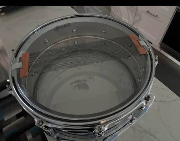 6.5x14 snare drum from Ludwig. Chrome plated, seamless, beaded aluminum shell, with P88AC strainer that has locking technology. It’s only about 8 years old, so it’s a newer model.