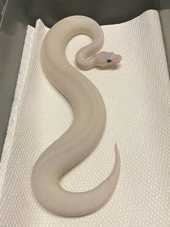 Looking to rehome a male yearling blue eyed leucistic lesser x mojave ball python. The rehoming fee is $300