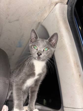 Beautiful female Gray Kitten with white feet. About 2 months old. Looking for a warm home. Very friendly and affectionate. 50 dollar rehoming fee.