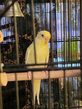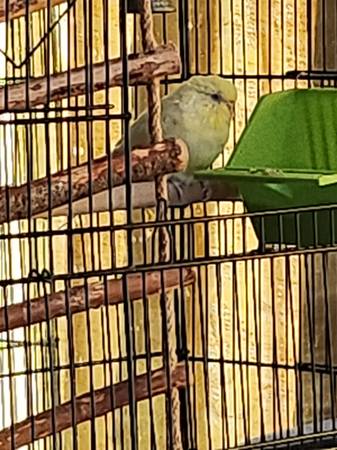 Cute, yellow female parakeet in need a new home. Untrained, but brings joy from a distance with her pleasant, happy chirps and bright yellow color. She comes with her cage, dishes, and cage...
