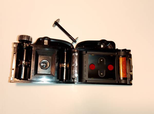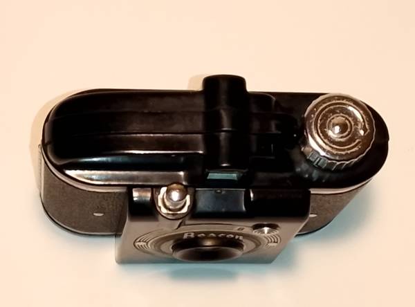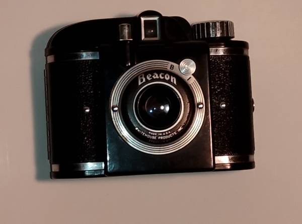 Beacon art Deco Film Camera. The Beacon Camera was manufactured in circa 1946 by Whitehouse Products Inc., of Brooklyn New York. This snap-shot camera was constructed of plastic with a built-in optical view finder. The Art Deco contours and the use of chrome and shiney black pebble finish plastic make this a very attractive camera. This small camera has an extending body which telescopes out for taking pictures. The winding knob is plastic with fake chrome covering.