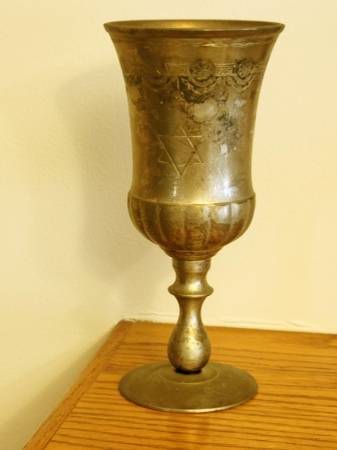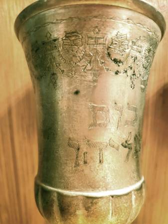 Solid metal antique cup with Jewish symbolics, 7 inches high. Not damaged but need clean up before using. Self pick-up from Seagate, Brooklyn, NY. Cash only