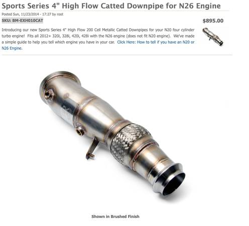 Selling ER sports series 4" catted down pipe. Fits 2012+ 320i, 328i, 420i, 428i with n26 engine 200 cell No check engine light with this downpipe