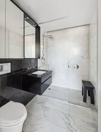 A split-wing layout ensures privacy and space for both bedrooms. The primary suite boasts a walk-in closet and a sumptuous en-suite bathroom with Carrara and Nero Marquina marble walls and floors, a custom floating vanity, a wall-mounted Hansgrohe faucet, and a walk-in rainfall shower. The second bedroom can accommodate a king-size bed and includes a large reach-in closet and easy access to the second full bathroom.