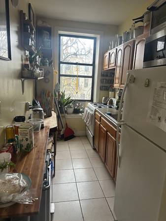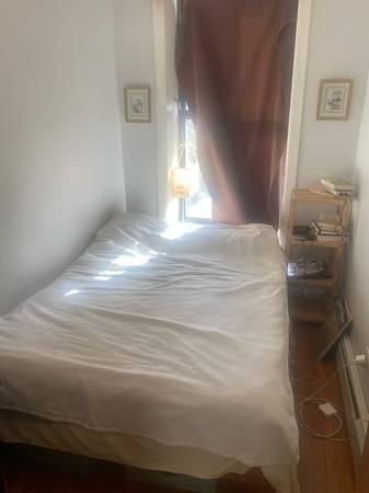 We're subletting a room in the top floor of our brownstone in Bedstuy. We have the entire brownstone; 6 bedrooms, 3 bathrooms, and 2 kitchens spread across the home. Your room would be on the top floor, sharing a bathroom with two people and a beautiful galley kitchen (pictured) with three people. The floor also has an enormous, sun-drenched living room filled with plants. The room (pictured) comfortably fits a full bed with room for furniture, and there are also closets in the living room you'd be welcome to share. The house has a washer/dryer on the ground floor, as well as a large backyard that's free for all roommates to use!