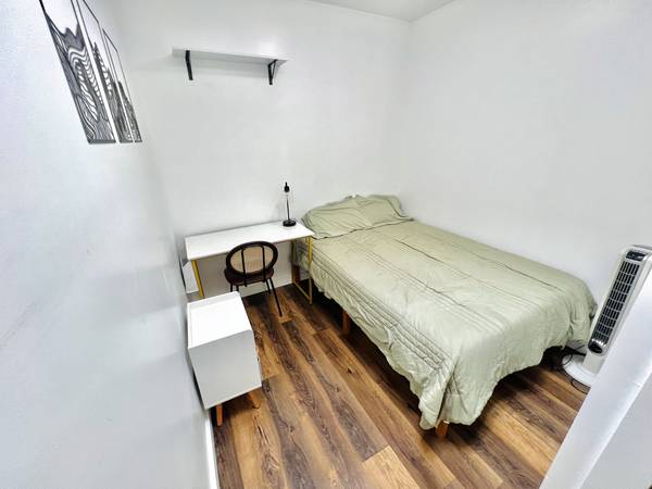 Full bed furnished bedroom with skylight available immediately in sprawling 3-story triplex. Place is massive but only shared with three roommates (one of which would be you), three floors, shared balcony, three bathrooms, private rooftop, dishwasher, monthly cleaner.