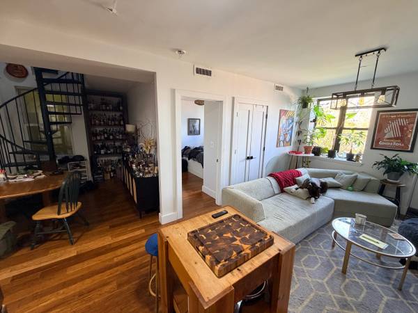 Malcom X Blvd & Pulaski St, Brooklyn. 6min walk from Kosciuszko St J, 8 min walk from Myrtle Bway JMZ. 4th floor walk-up duplex with a spiral stair and a private rooftop terrace and Juliette balcony. In-unit washer, in-building laundry room, gym, peloton bikes, work space, and gated courtyard. 1 full bath, several closets, plenty of natural light, gas stove, dishwasher, FIOS internet, very friendly neighbors. I have a 3yo 100lb boxer-pit mix who loves to lounge and eat and sometimes chase a ball, and lives downstairs with me all the time. You get the upstairs + terrace.