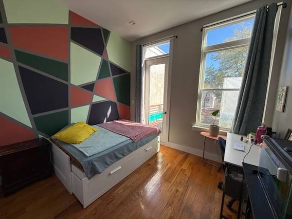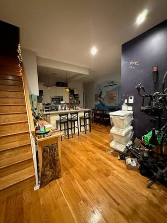 A cool room in the upper unit of a very nice modern duplex townhouse in Bushwick, Brooklyn will be available for rent starting January 1st. The place consists of a kitchen/dining room, a living room, two full bathrooms and one half bathroom, and five bedrooms. There are two floors, with the kitchen, one bedroom, and a full bathroom on the first floor; and the other four bedrooms and bathrooms and the living room on the second floor. Your room would be on the second floor.