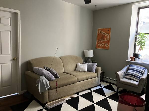 Building has roof access (unfinished roof). In summer the room does get hot and stuffy; we install an AC in the living room. The building has an elevator, laundry on each floor, and is located near Classon Av G train. There is a foster cat in the apartment.