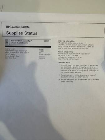 Works well. Nearly full toner cartridge installed. Can test prior to purchasing.