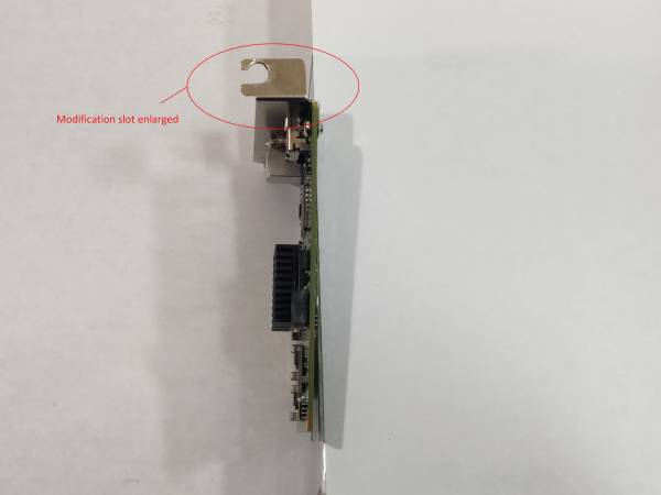 PCI-E bracket was removed and modified to fir custom rig. A washer is