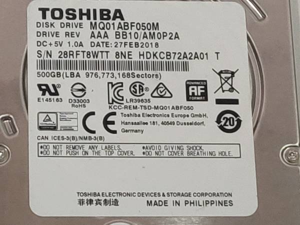 Item: TOSHIBA MQ01ABF050M ULTRABOOK SERIES 500GB 5400RPM SATA III HDD HARD DRIVE