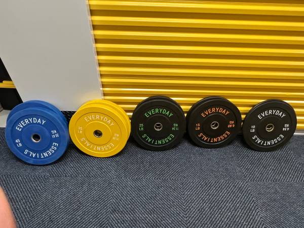 I have 14 pairs of 45, 35, 25, 15, and 10-pound Olympic Bumper Plates. These are all colored. I also have dumbbells available for sale.
