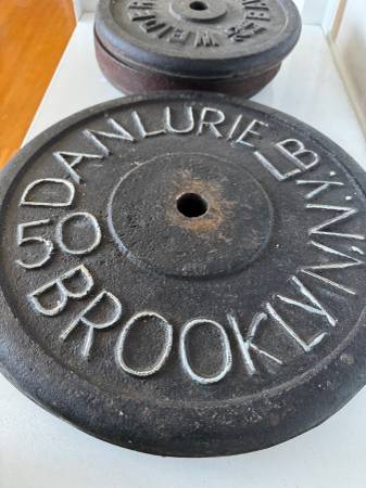 Cool vintage 1 in weight plates @ $1/lb OBO Take all 495 lbs for only $300! 2 x 50 lbs 7 x 25 lbs 2 x 13.2 lbs 7 x 10 lbs 2 x 8 lbs 16 x 5 lbs 6 x 3 lbs 4 x 2.5 lbs Pick up only from Ft. Greene,...