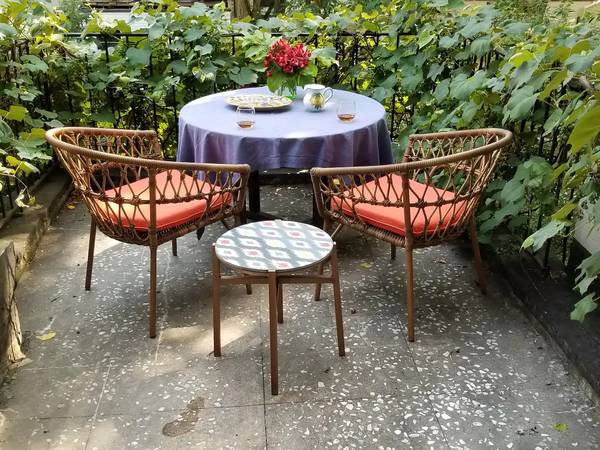 Quiet bedroom and private terrace overlook gardens. Living room and separate kitchen face quiet street.