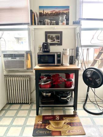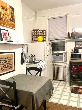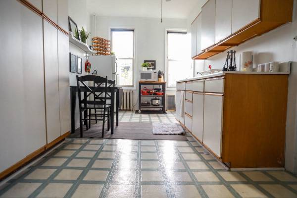 Classic Brooklyn style with loads of character and charm, older cabinets and sloped floors, but clean and cute and cozy. Bathroom with full tub off kitchen, (shares the kitchen sink).