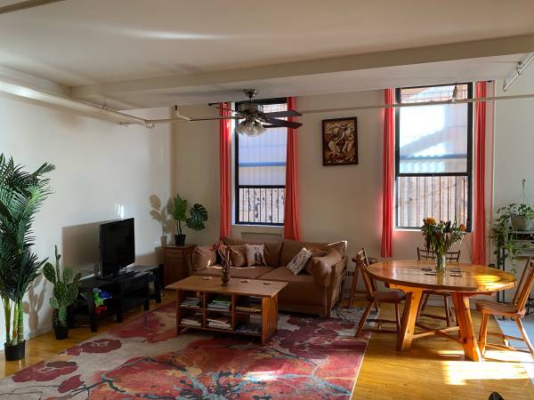 The apartment is massive and the bedroom has a big closet. The place is fully furnished (couch, TV, dining table, desks, appliances, etc.) and the room has a queen-size bed, dresser, and bookshelf.