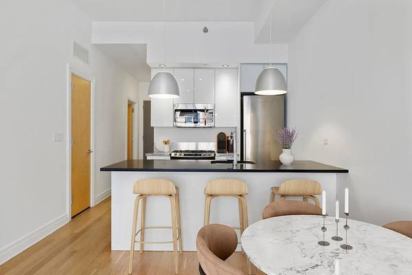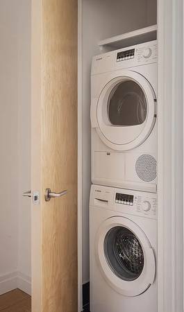 Rich hardwood floors run throughout, pairing seamlessly with stainless-steel appliances, LED track lighting, an in-sink garbage disposal, and a Bosch stackable washer/dryer for effortless convenience.