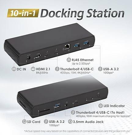 HDMI 2.1 output supports up to 8K30Hz; Ethernet RJ45 port supports up to 2.5Gbps (approximately 300 Megabytes per sec). Note: Thunderbolt bandwidth is shared across devices, so display resolution and LAN speed may decrease with multiple high-bandwidth connections. When fully loaded, the docking station may reach 122°F/50°C, which is normal for such products.