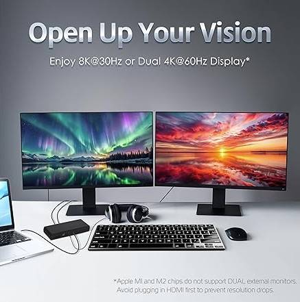 Supports Thunderbolt and USB4 function. Supports dual 4K@60Hz displays via two Thunderbolt 4 USB-C ports. Note: Verify your laptop's Thunderbolt ports support dual 4K@60Hz output. Ensure your graphics card installed the latest drivers. Confirm your monitors support 4K@60Hz display. Use high-quality Thunderbolt 4 or USB4 cables for connection (not included). Avoid connect HDMI port firstly to prevent resolution downgrade due to bandwidth limitations.