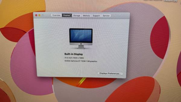 Apple iMac 21.5 inch Late 2013 version 2.9 GHz quad core intel core i5 Memory: 8 GB 1600 MHz DDR3 Graphics: Nvidia GeForce GT 750M 1GB
