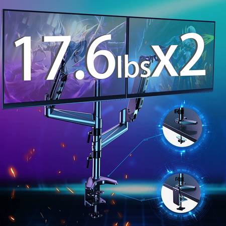 The safety and efficiency of your monitor’s placement is no longer an issue. Clear up valuable work space and provide ergonomic viewing angles with HUANUO premium gas spring dual monitor stand. Fits most LCD LED monitors 17" to 32" in size and supports up to 17.6 lbs per each monitor. Its made from high quality polished aluminum die-cast solid steel for durability. Built in with ultra-precision gas-strut, passed 25,000-cycle adjustment motion tests, gas spring attenuation rate is below 5%, which ensures a minimum of 5 years trouble-free height adjustment. With full range of motion that provides unsurpassed ergonomic comfort, enhances your healthy life style and improves productivity in both home and offices.