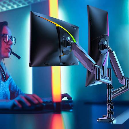 This dual monitor stand support both C clamp and grommet mounting, both of which provide stable supports for your monitors.