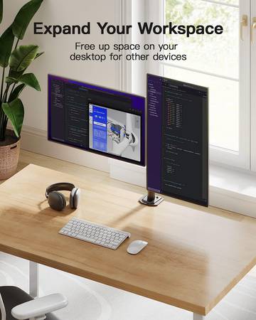 Free Up Desktop Space: This dual monitor arm for desk with a concealed wiring design can help keep your desk organized and get your double monitors up from your desk, freeing up valuable space for a more comfortable experience
