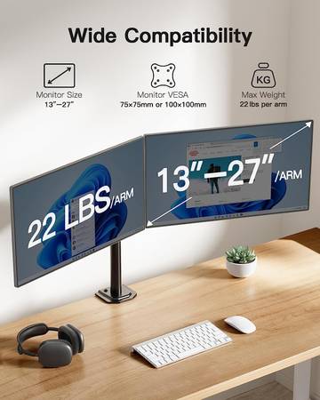 Monitor Stand Most Fits 13" To 27" Screens - HUANUO Dual monitor stand mount fitting two screens 13” to 27” in size and maximum support weight up to 17.6lbs per arm, compatible with VESA mounting hole 75x75mm and 100x100mm.