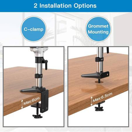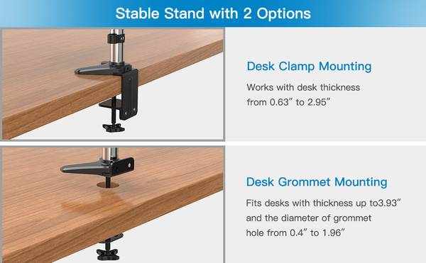 STABLE SUPPORT & SPACIOUS DESKTOP - The triangle design and solid construction ensure the stability of the base. Both clamp and grommet mounting provide reliable support for your monitors on the arms, saving much valuable desk space.