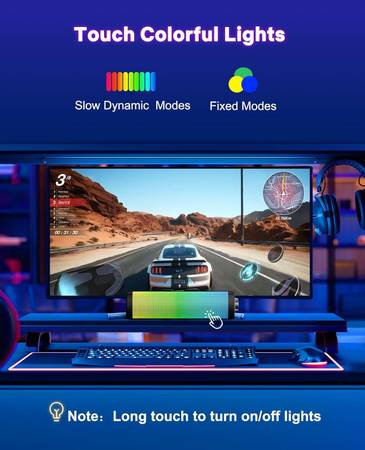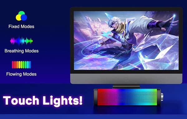Touch Lights: Touch the computer speaker screen anywhere can switch 5 light modes. Increase the game or music atmosphere. Long touch the screen to turn on/off lights.