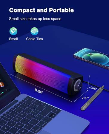 Cable Ties & Compact Portable: PC speakers increase cable ties to organize cables and take up less space. Small and compact size perfectly sits unobtrusively below the monitor.