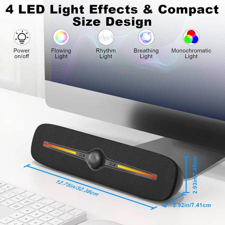 4 DYNAMIC LIGHT MODES: With 4 modes colorful led lights effects, which can be switched in one click. You can also turn on/off the light by the light button on the sound bar. With these lights to enhance the atmosphere of listening to music watching movies, and playing games