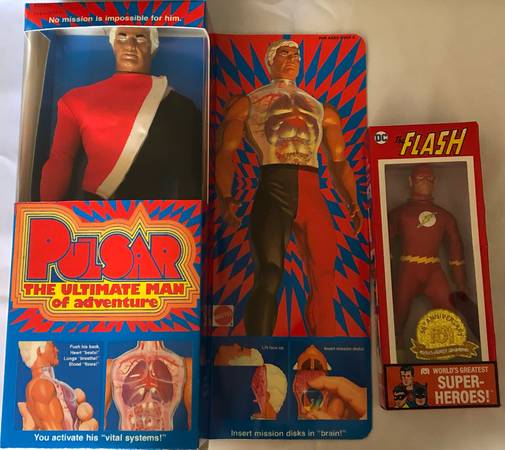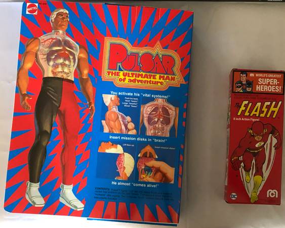 MATTEL PULSAR IN REPRODUCTION BOX - no rips to the clothing, clean, joints are excellent, some paint wear on the head, he is missing the emblem on his jacket and missing the disc in his brain