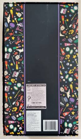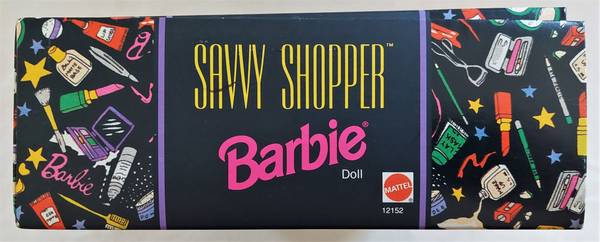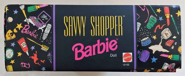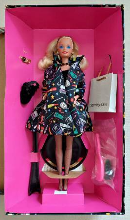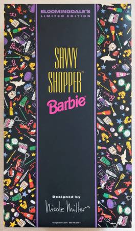 The Savvy Shopper Barbie Bloomingdale's limited edition series is designed by Nicole Miller. Barbie is dressed in a fashionably printed coat, black dress and gold earrings. Accessories included are a hair brush, pumps, purse, gold sunglasses, and a Bloomingdale's shopping bag. To display the doll a stand is tucked behind her. The box is in very good condition with minor wear.
