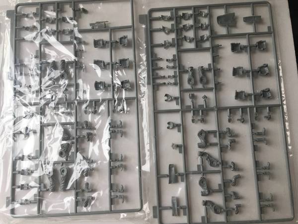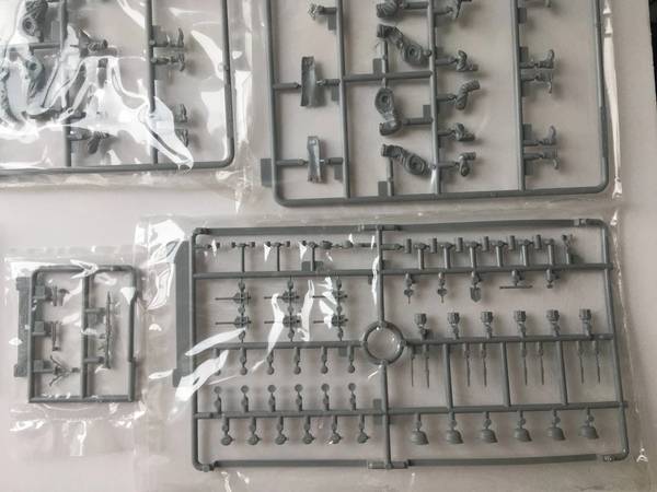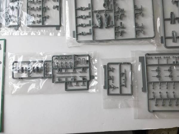 Over 400 parts, including four large styrene sprues for figures and gear, plus smaller sprues and two photo‑etched brass frets for insignia and belt fittings.