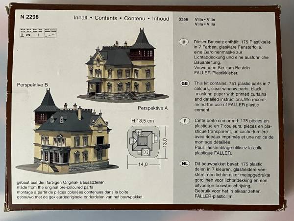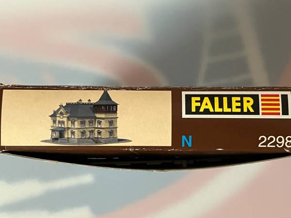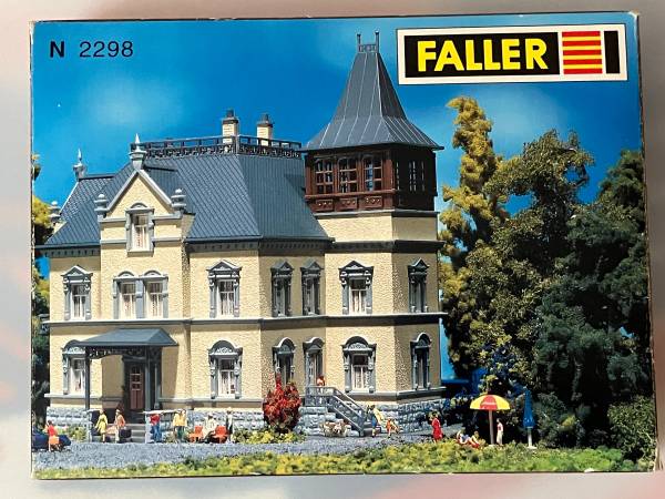 The FALLER 2298 represents a finely detailed luxury villa in the European style, designed as a standout residential structure for N scale layouts. The model captures the proportions and decorative details of an upscale home, featuring a multi-story arrangement with elegant facades, prominent roof sections, and refined architectural ornamentation.