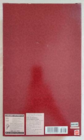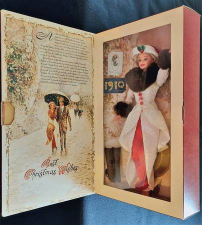 The Holiday Memories Barbie is a 2nd in the series of the Hallmark Special Edition collection released in 1995 and created exclusively for the 85th anniversary of Hallmark. The doll is displayed with a 1910 calendar year and is wearing a Gilded age like skirt, coat, hat, earrings, hand ring and a pair of boots are attached on the side. The box is in a good condition with a flap that opens up like a book with a beautiful illustrations inside. Slight spot at the top left side and a small scratch on the back of the box at the top.